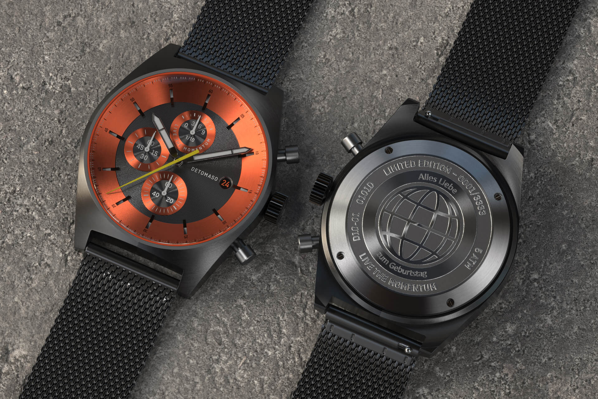 Inspiration struck for DETOMASO watches on a road trip through Italy in a 1970s classic Italian sports car. The beautiful Italian countryside combined with the legendary design of the classic car are what brought DETOMASO to life. Each watch model is not only a statement of quality, but a testament to our story of breaking the chains of everyday life and experiencing one's own freedom - LIVE THE MOMENTUM.