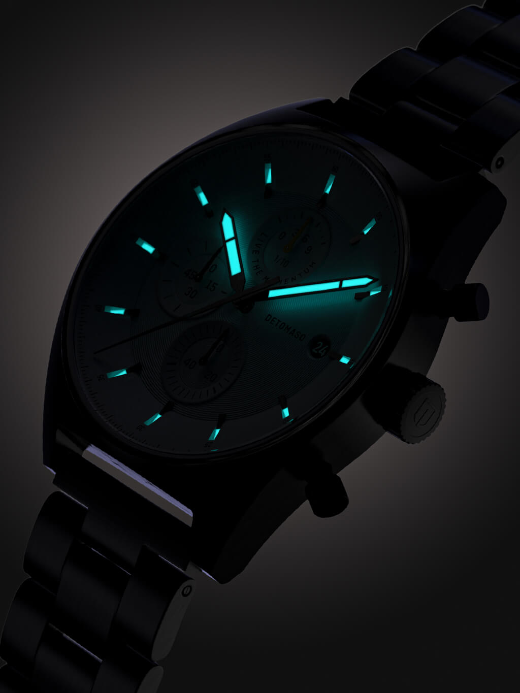A highlight of the D10 CHRONOGRAPH becomes truly visible in the dark. The hour and minute hands are coated with Superluminova. In the dark, these elements begin to glow – allowing you to read the time at a glance, even at night.