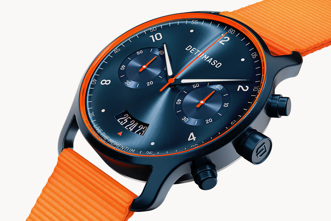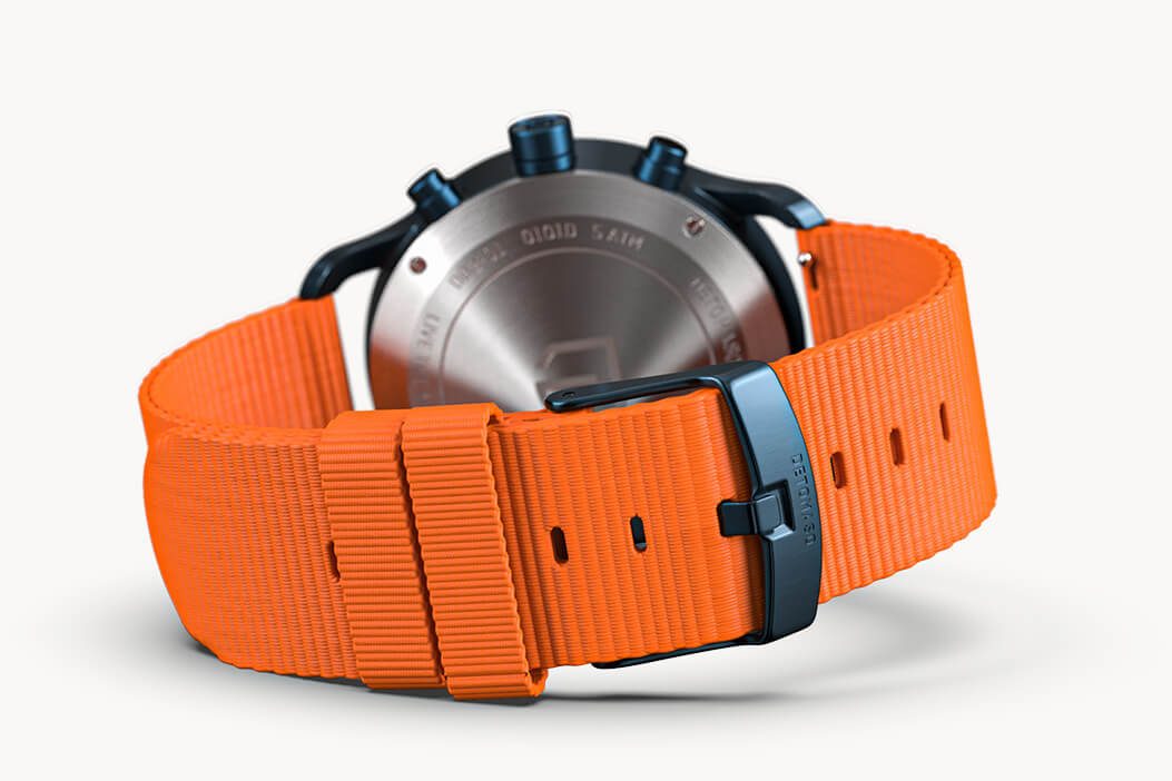The surroundings meld with the here and now. Like a time traveler, the driver is in his own world. In a moment that only exists for him – nothing mundane, only speed and adrenaline. VELOCITÀ is the Italian word for speed and this is what the Chronograph epitomizes with its dynamic case, sporty chronograph displays and neon highlights.