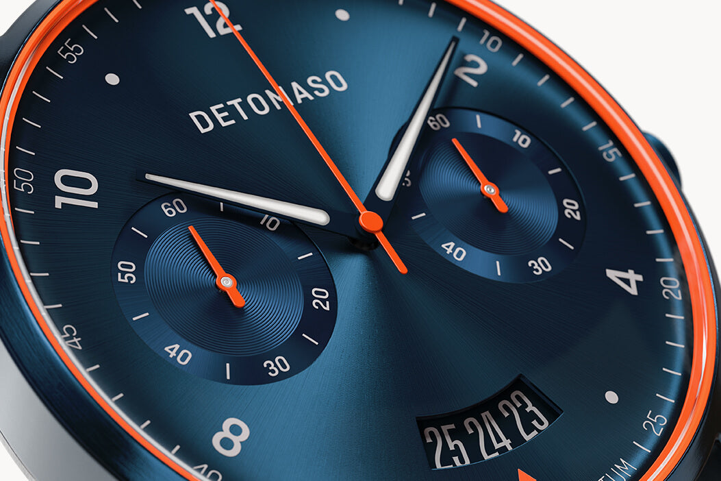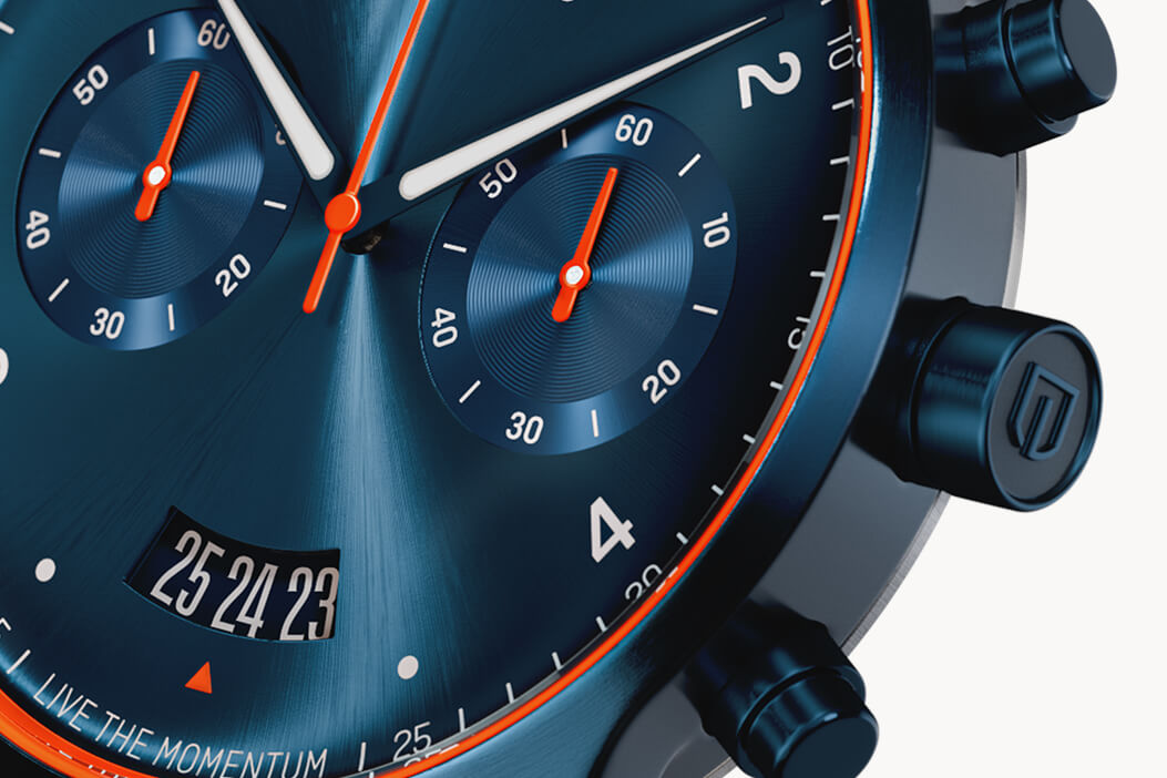 The surroundings speed by in a blur and lights stretch into long streaks. In Italian, SORPASSO means overtaking – and the VELOCITÀ version of the SORPASSO CHRONOGRAPH takes it one step further. The neon highlights represent the contrast between the black asphalt and the intense lights. The sunray dial also includes a stopwatch feature, so you can record your best time.