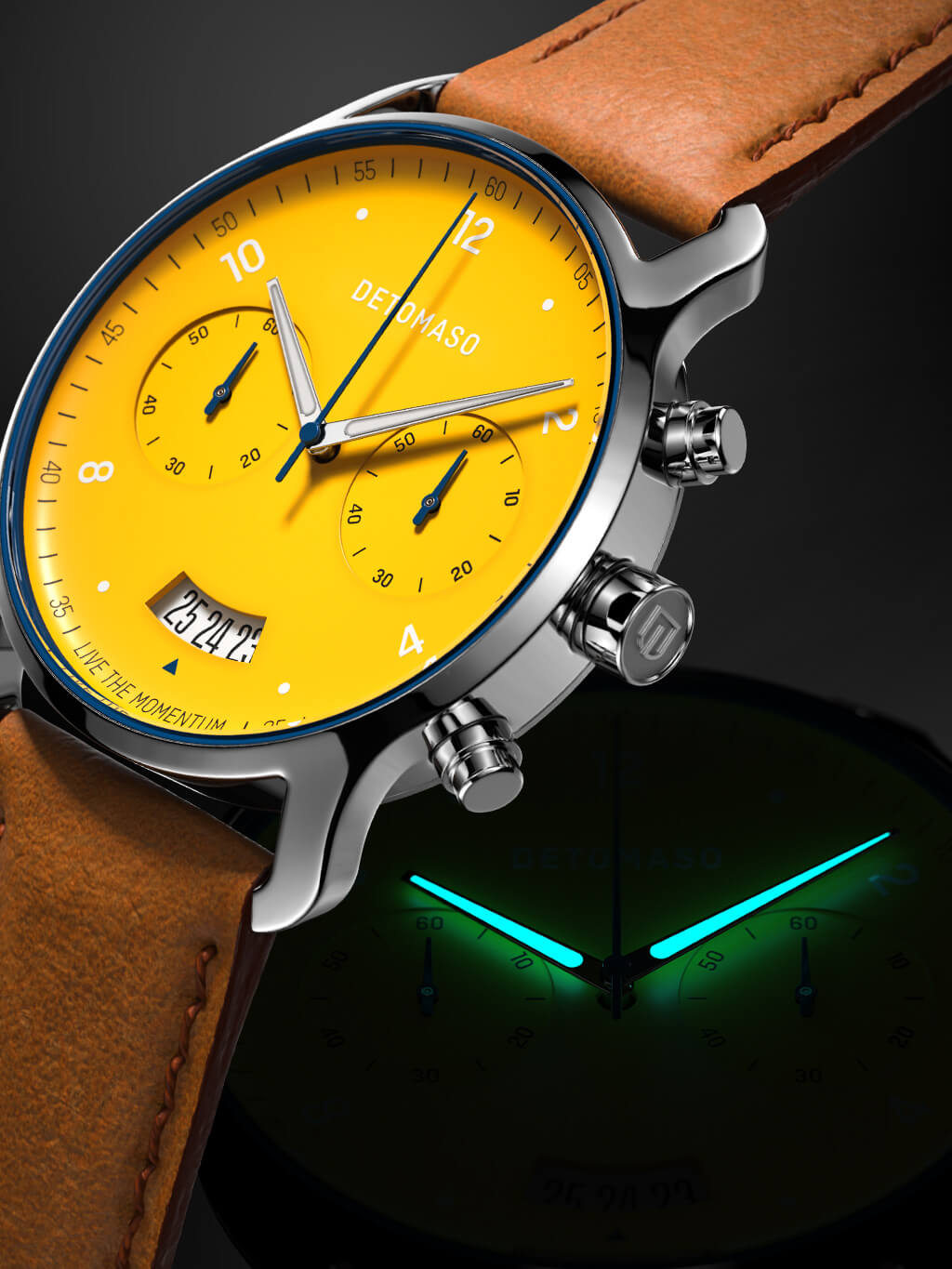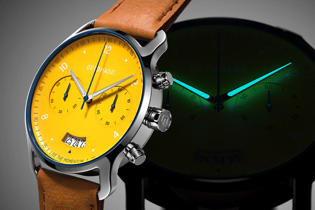 Goosebumps, sweat and joy: Since ages have drivers and fans been fascinated by motor sport. No matter if glorious triumphs or neck-and-neck races: the focus is on the fun. So the yellow of the SORPASSO CHRONOGRAPH speaks for itself and shines along with the watch owner.