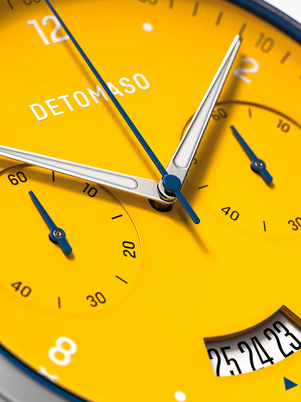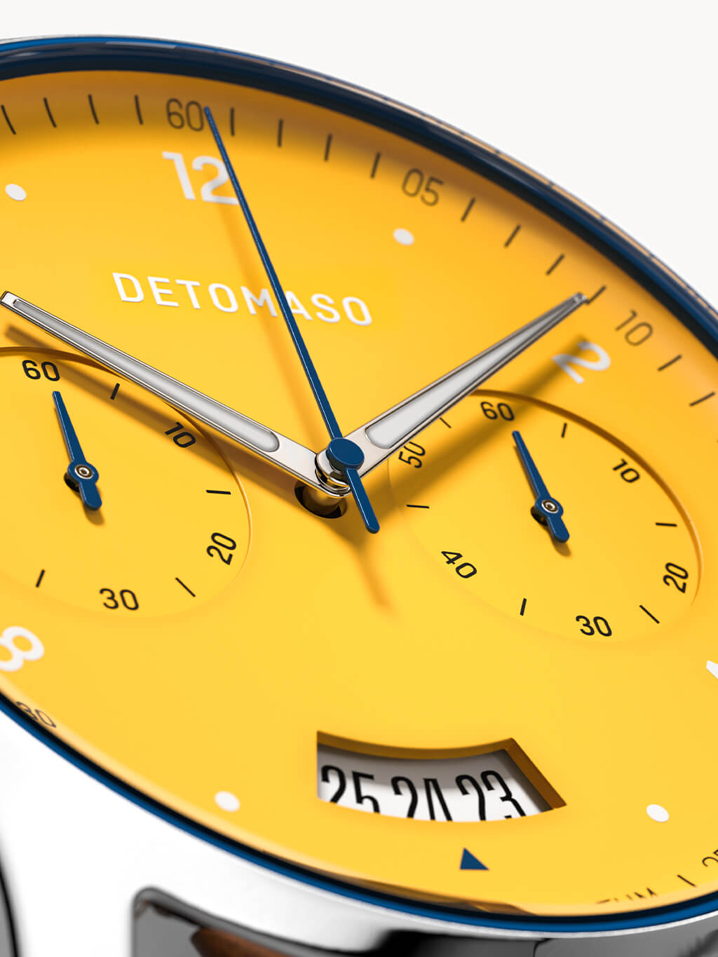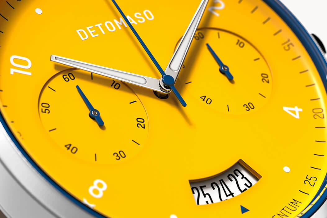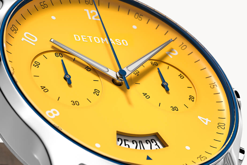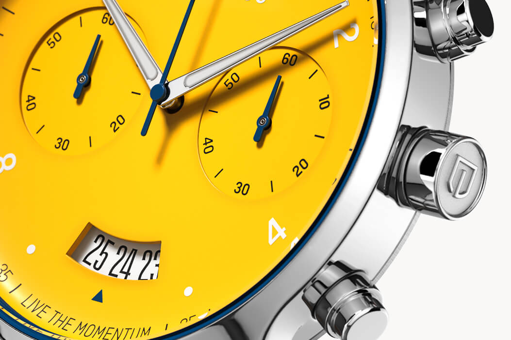 ... through the racetrack and straight to the finish line. Adrenaline for your wrist? The chronograph's racing design makes this possible now. The bright yellow combined with the deep blue highlights carry the observer away into the world of racing. Exciting highlights and dynamic shapes round off the look and let the SORPASSO CHRONOGRAPH continue past the finish line.