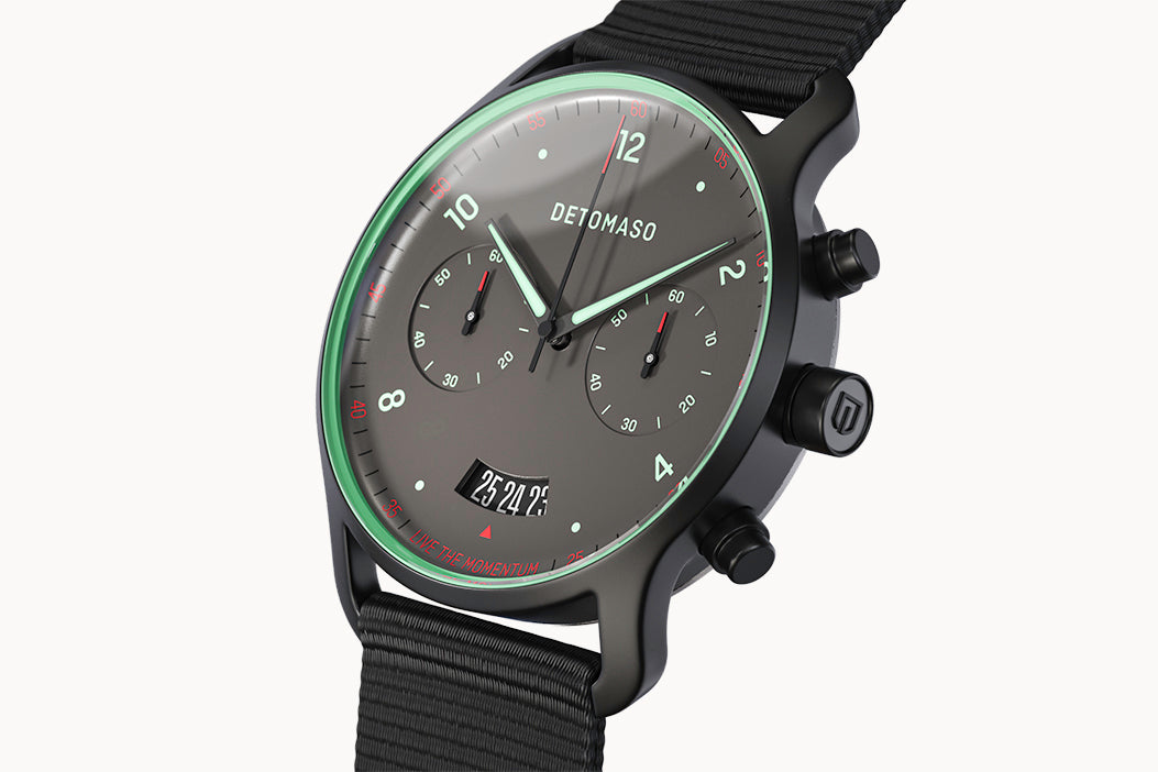The complex movement from the heritage manufacturer Miyota features a chronograph function. Two pushers on the side of the case are all you need to operate it: One pusher starts the chronograph indicators, and a second pusher stops them. To ensure you don't lose track of time, the SORPASSO CHRONOGRAPH also keeps the whole day in view with its date function.