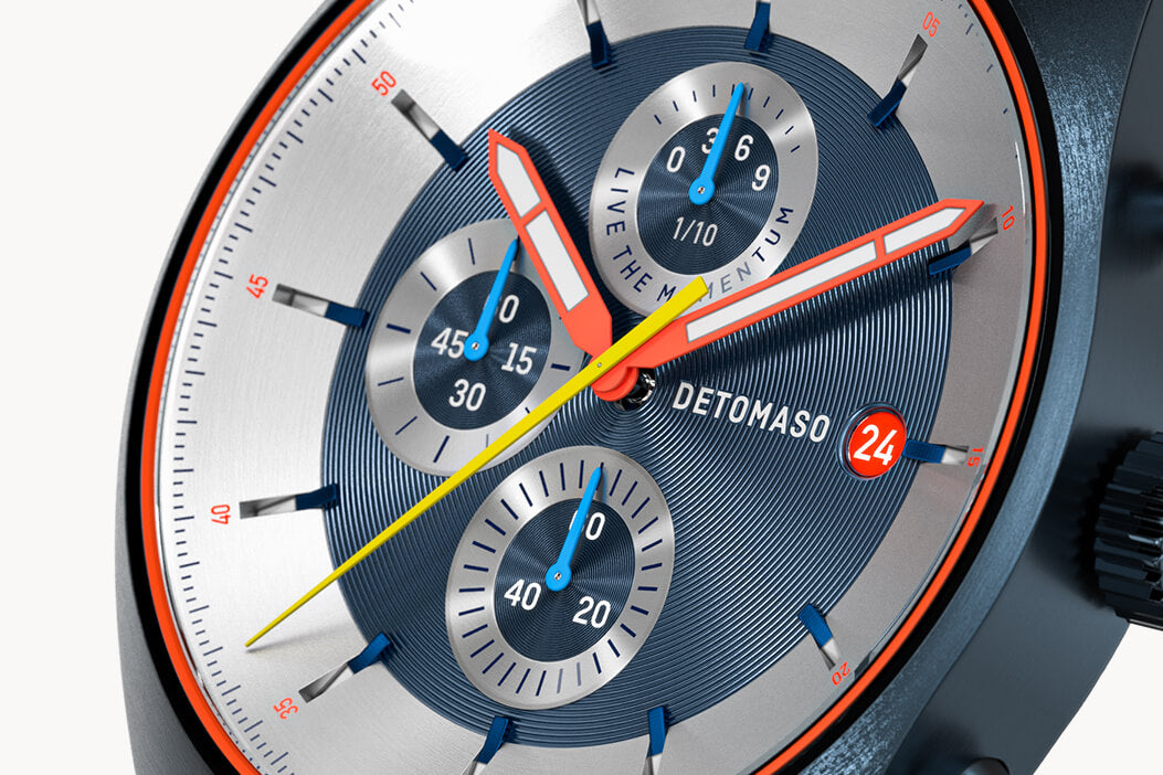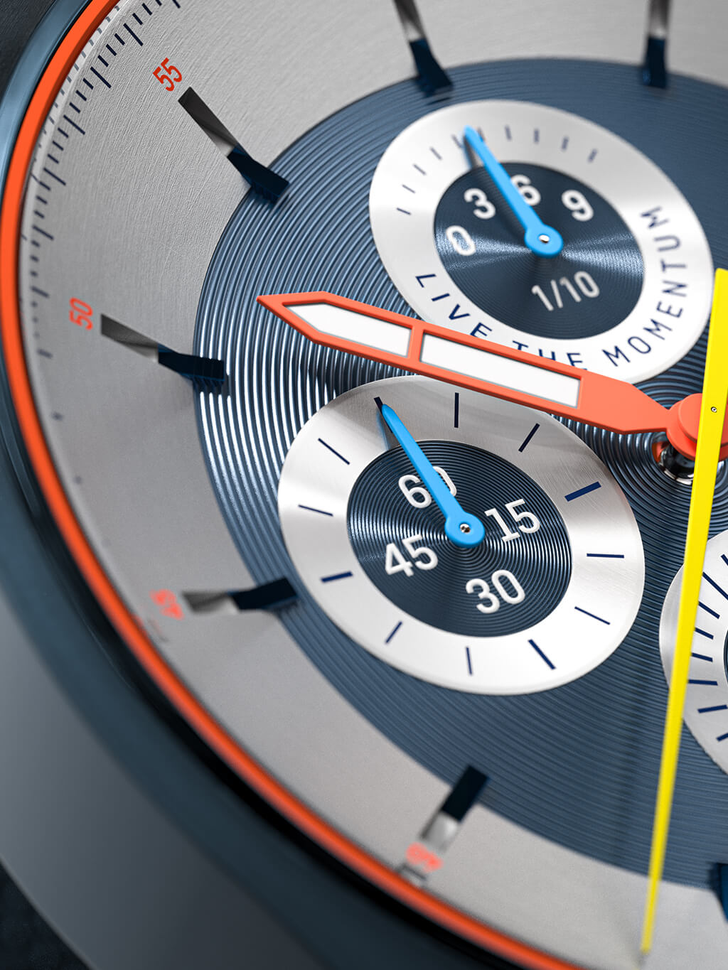 The D10 CHRONOGRAPH is not only inspired by the desire for travel, but rather also by the extraordinary designs from the 70s. Because which era stood more for a pioneering spirit than this? Round shapes and striking color accents provide for a stylish retro tribute. This makes the chronograph extremely dynamic in its own way.