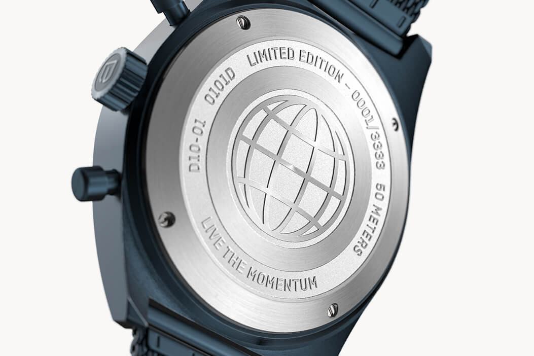 The chronograph is a true companion for everyone who has found their own rhythm and is at home anywhere in the world. The engraved globe on the backside of the watch is a remembrance of this feeling. Additional highlight: next to this is an individual serial number from the D10 CHRONOGRAPH. Because it is limited to 3333 pieces and therefore a unique companion.