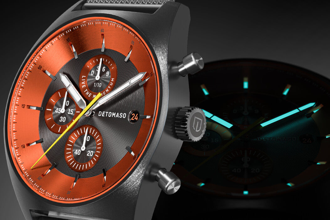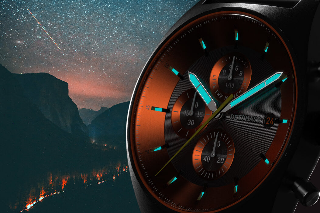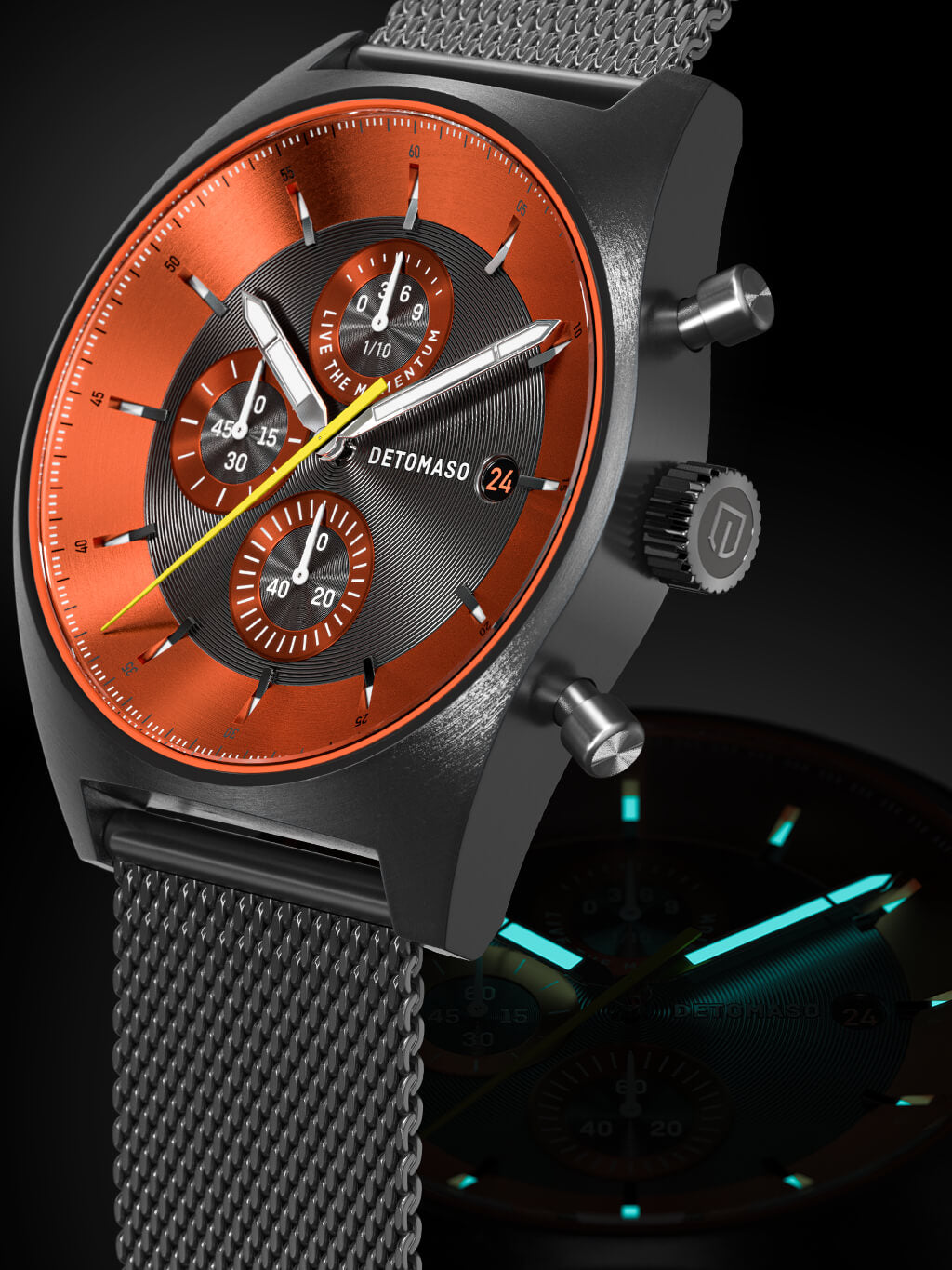 It's when the lights go down that the D10 CHRONOGRAPH really comes to life. Its hour and minute hands are coated with Superluminova. In the dark, this material glows – making it possible to tell the time at a glance, even at night.
