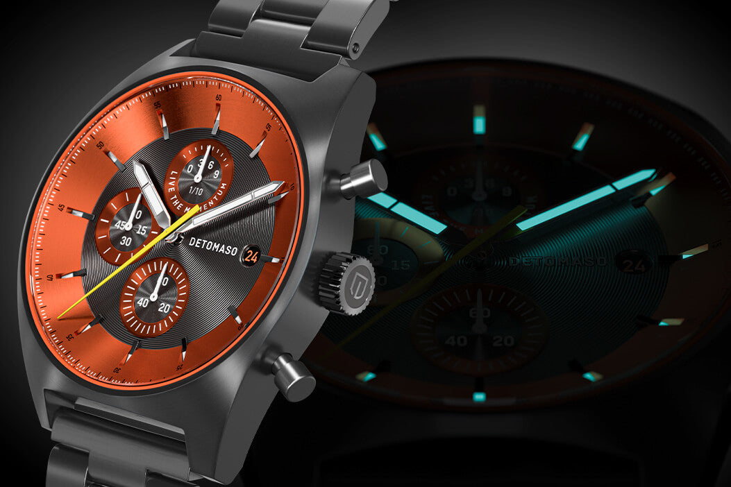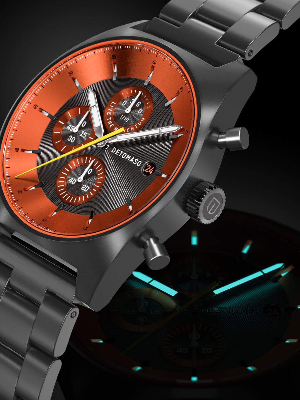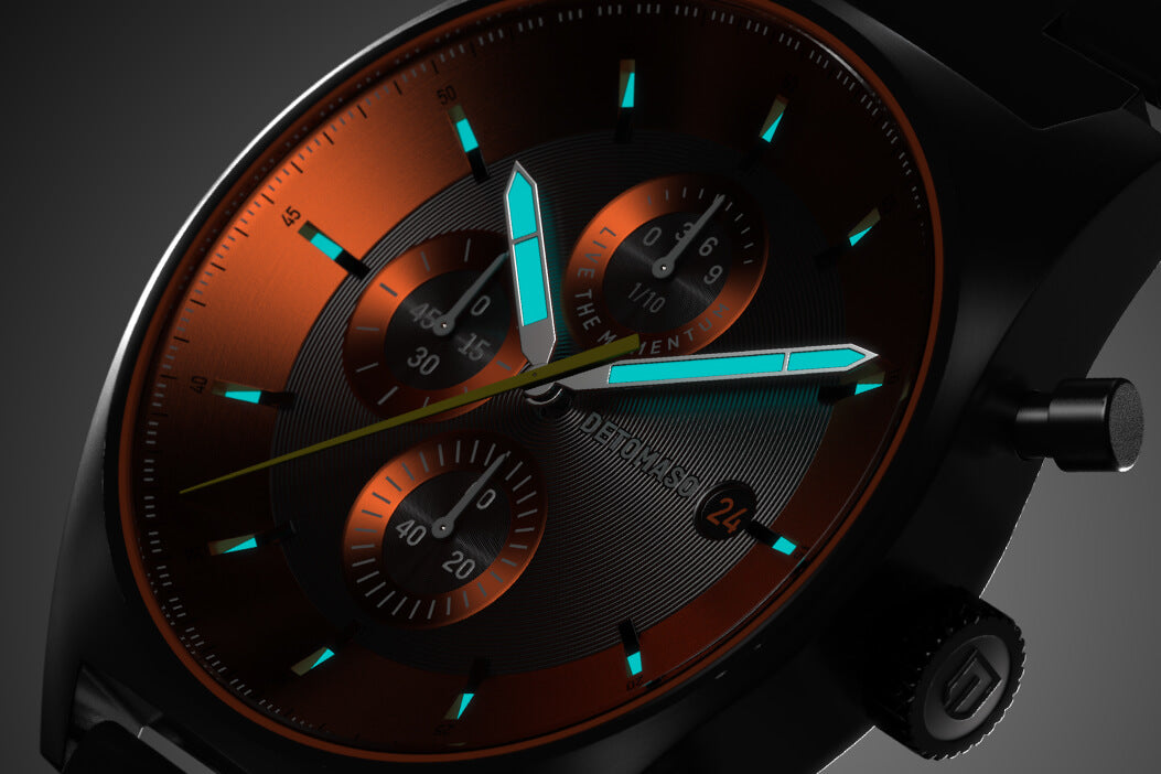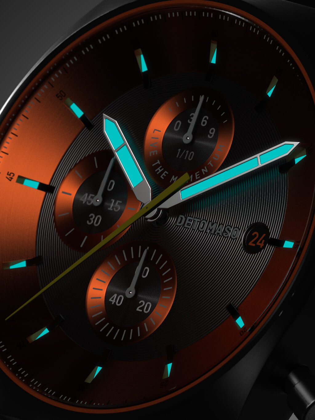 It's when the lights go down that the D10 CHRONOGRAPH really comes to life. Its hour and minute hands are coated with Superluminova. In the dark, this material glows – making it possible to tell the time at a glance, even at night.