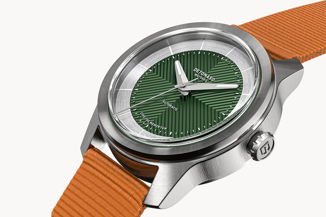 Very beautiful navy blue automatic watch with orange crown that reminds me of the sea and the sun. The watch is accurate with a good power reserve all at a competitive price.