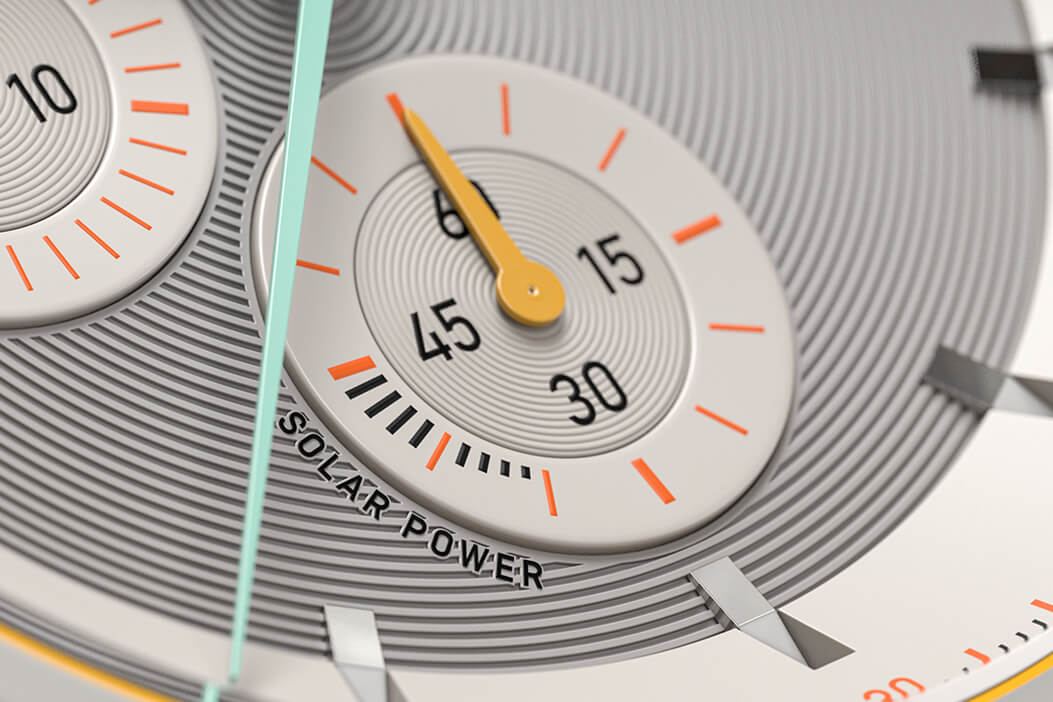 To check the energy status of the D10 CHRONO SOLAR, simply press button B for longer than one second. The energy status will then be displayed in the lower chronograph sub-dial. Of course, the watch continues to function even when there is no light available - for up to five months. And when it is depleted, just a few hours in the light are enough to recharge the watch.