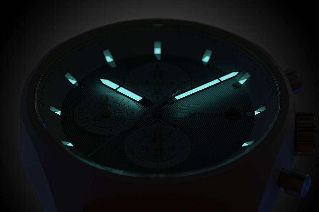 Another highlight is really only visible in the dark: the hour and minute hands and the hour markers are coated with Superluminova. This makes it possible to tell the time at a glance, even at night.