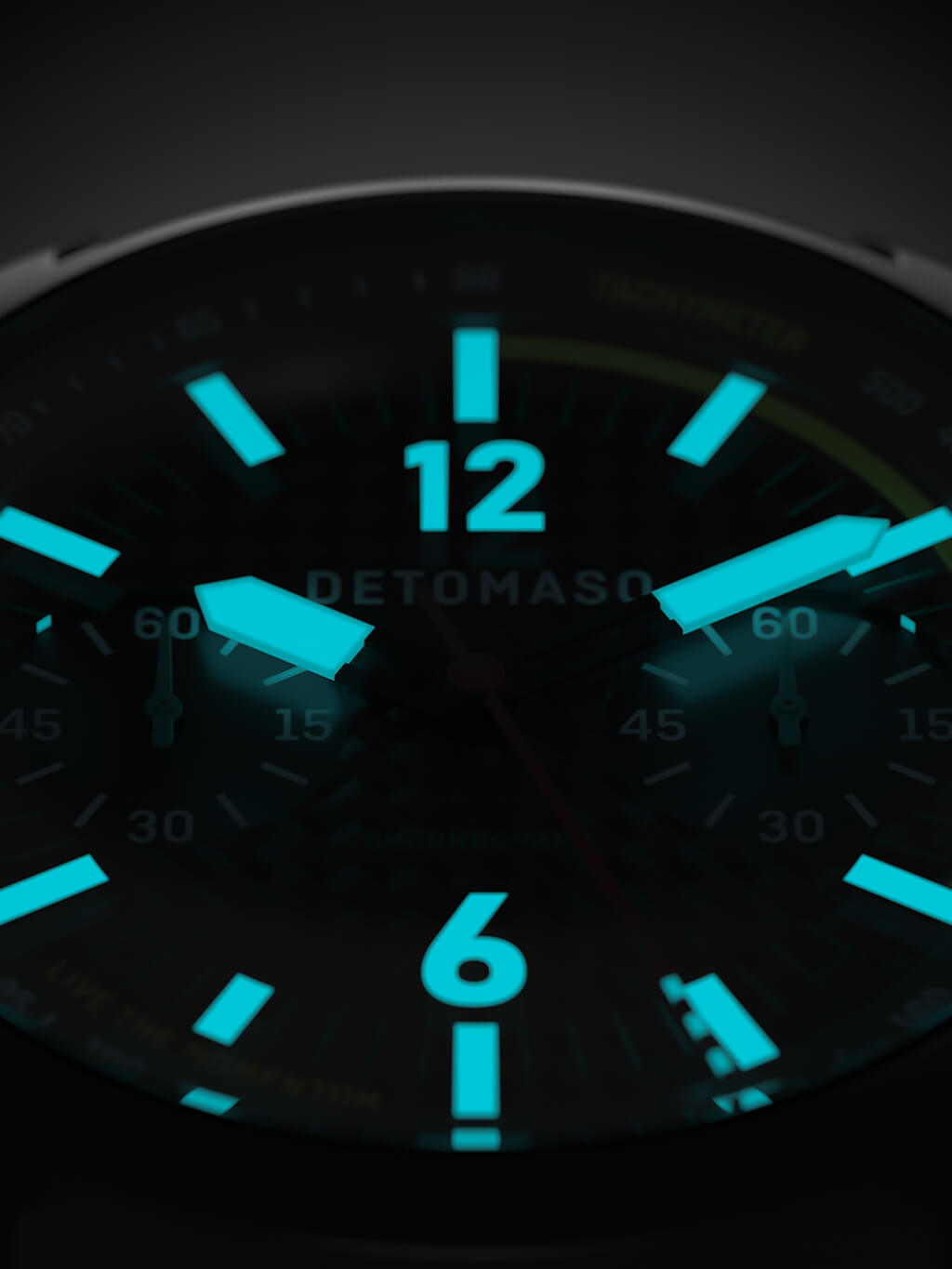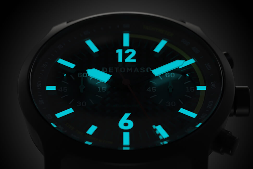Reach your goals at high speed: measure the time with the pushers on the side of the case. The first pusher sets the chronograph display in motion, the second stops it. And best of all, you can also rely on your SORPASSO CHRONOGRAPH CARBON at night thanks to Superluminova on the hands and hour markers.